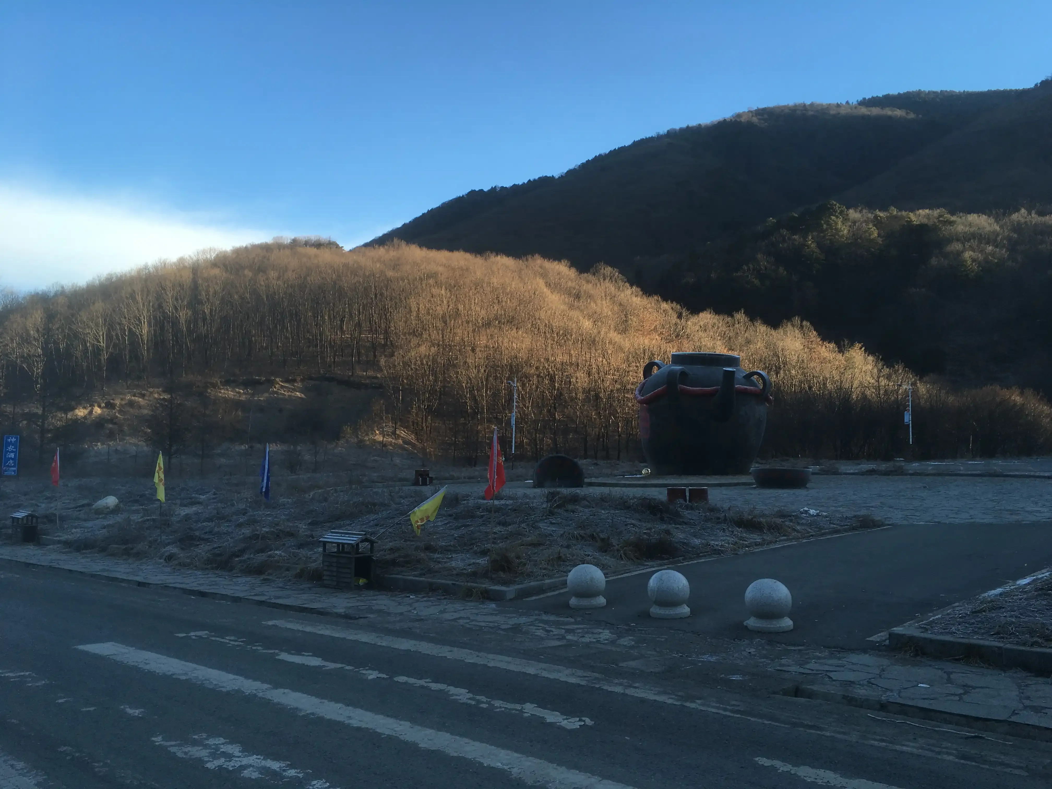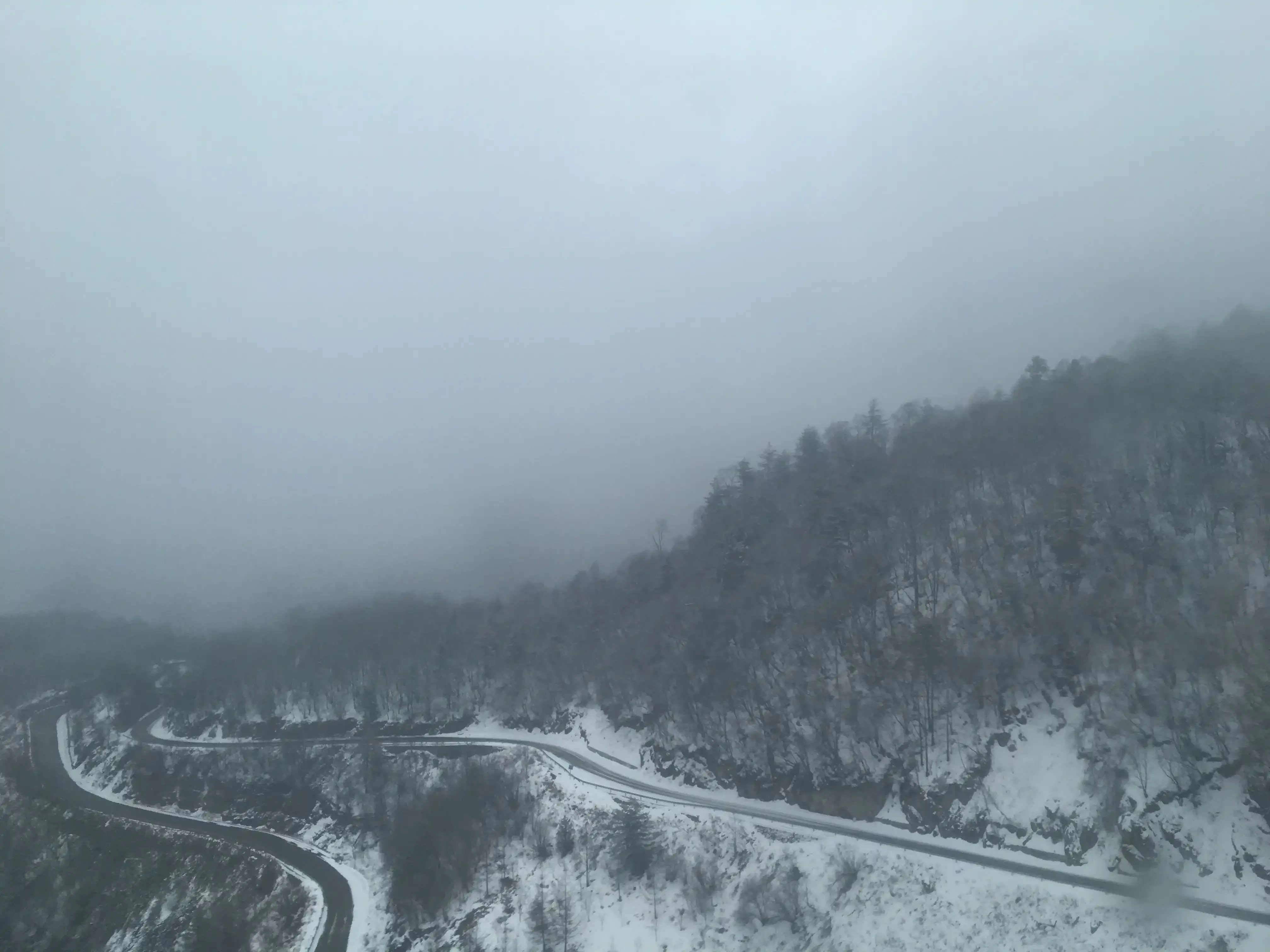 待第二天返回山下时,看到了传闻中的景象:山上是万里雪飘的下,而山下却是放晴的。我想这里的大巴司机是每天都要穿过了两个季节的,带着自己带着乘客,开往梦幻的山庄,只等待着后会有期。