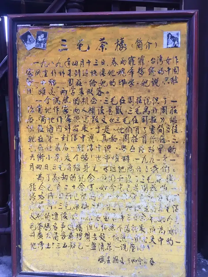 在来到周庄古镇之前,我并不知道这里有一个三毛茶楼,那时我也还没读到三毛写周庄的故事,却提前听说了茶楼主人的事迹。我想,如果三毛知道了,哪怕天南地北她也会赶来吧。